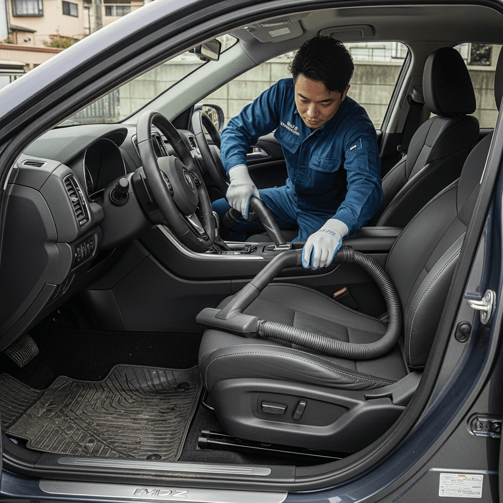 MS-8は第一印象が査定の8割を決めます。シート隙間のゴミ除去、マット洗浄、樹脂パーツ艶出しで新車級の清潔感に。特に臭いゼロなら「禁煙車」扱いで+5~8万円UP。