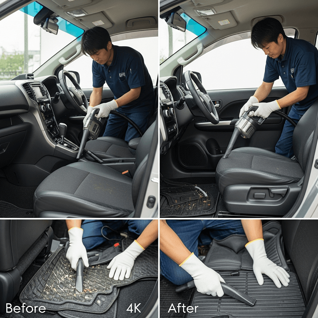 ミューウィザードは第一印象が査定の8割を決めます。シート隙間のゴミ除去、マット洗浄、樹脂パーツ艶出しで新車級の清潔感に。特に臭いゼロなら「禁煙車」扱いで+5~8万円UP。