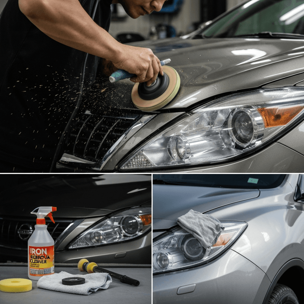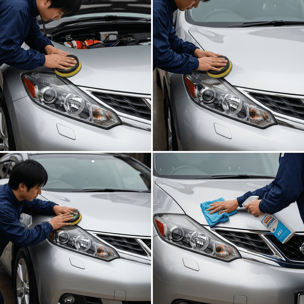 ムラーノはヘッドライトの黄ばみとボディの鉄粉が第一印象を損ねます。研磨+鉄粉除去クリーナー+ワックスで輝きを取り戻せば「程度良好」と判断され+4~7万円の効果。