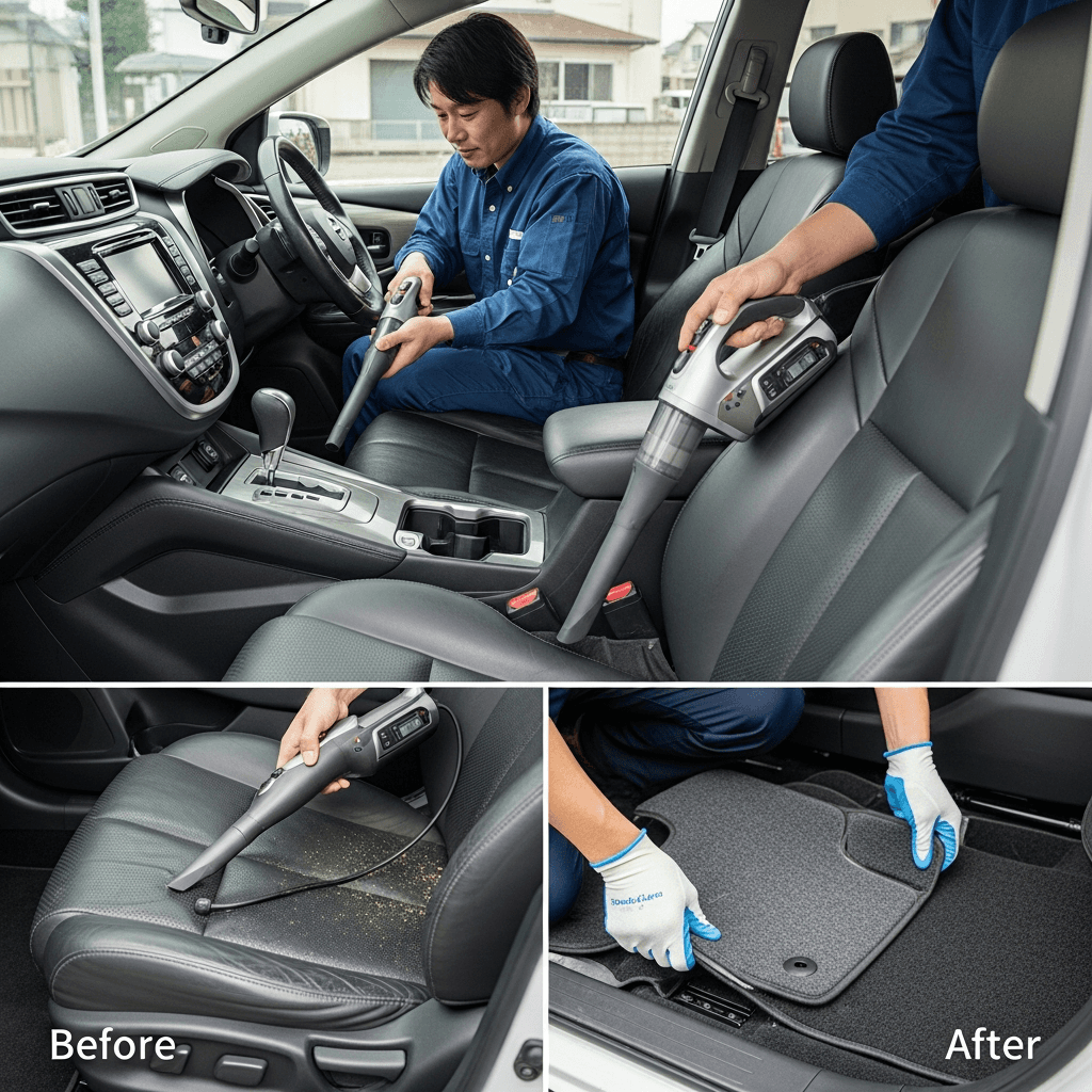 ムラーノは第一印象が査定の8割を決めます。シート隙間のゴミ除去、マット洗浄、樹脂パーツ艶出しで新車級の清潔感に。特に臭いゼロなら「禁煙車」扱いで+5~8万円UP。