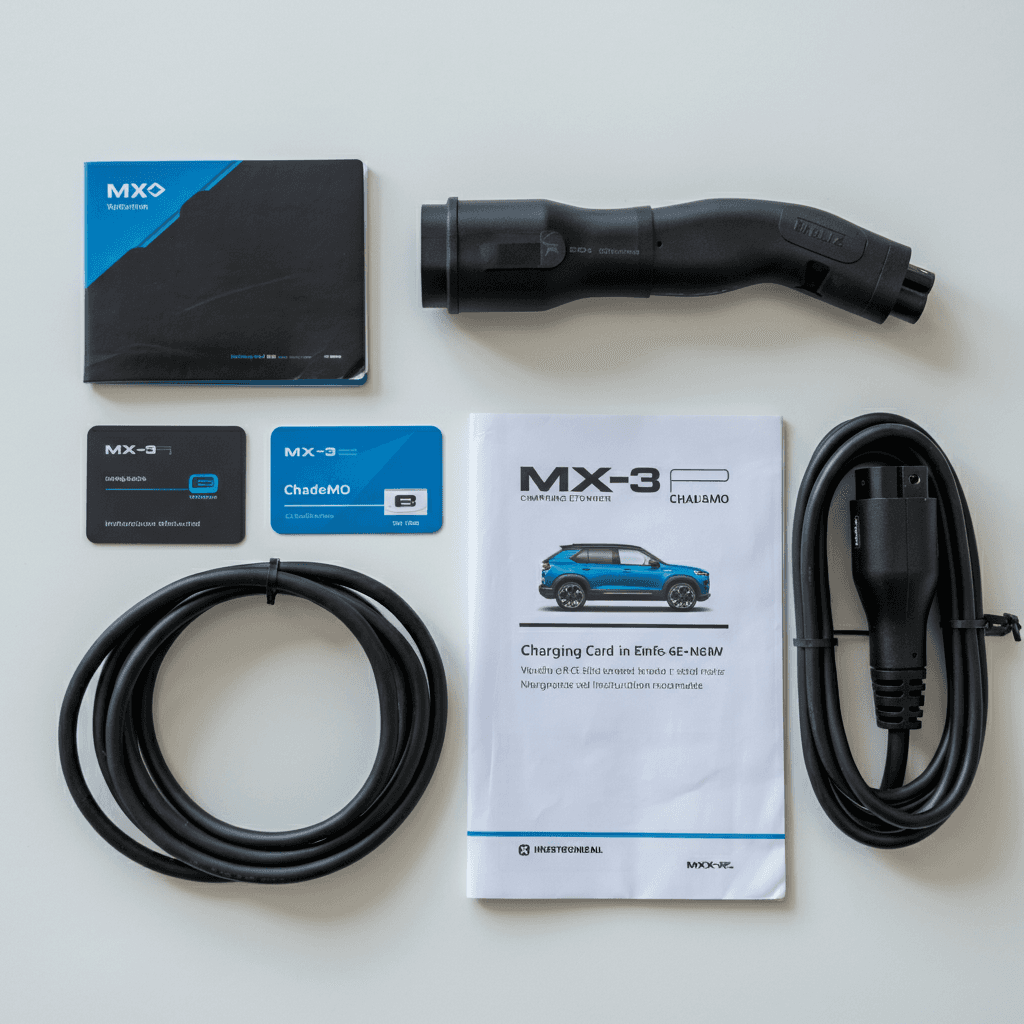 EV車の査定は充電環境が全て。MX-30 EVモデルの純正充電ケーブル(普通・急速)、充電カード(会員証)、アダプター類を全て揃えて撮影。「すぐ使える」安心感で+6~10万円UPが期待できます。