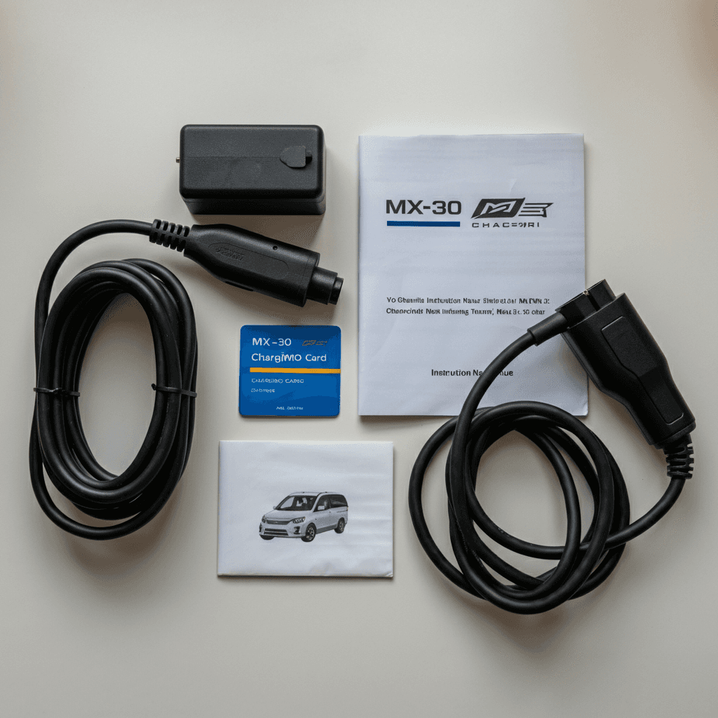 EV車の査定は充電環境が全て。MX-30ロータリーEVの純正充電ケーブル(普通・急速)、充電カード(会員証)、アダプター類を全て揃えて撮影。「すぐ使える」安心感で+6~10万円UPが期待できます。