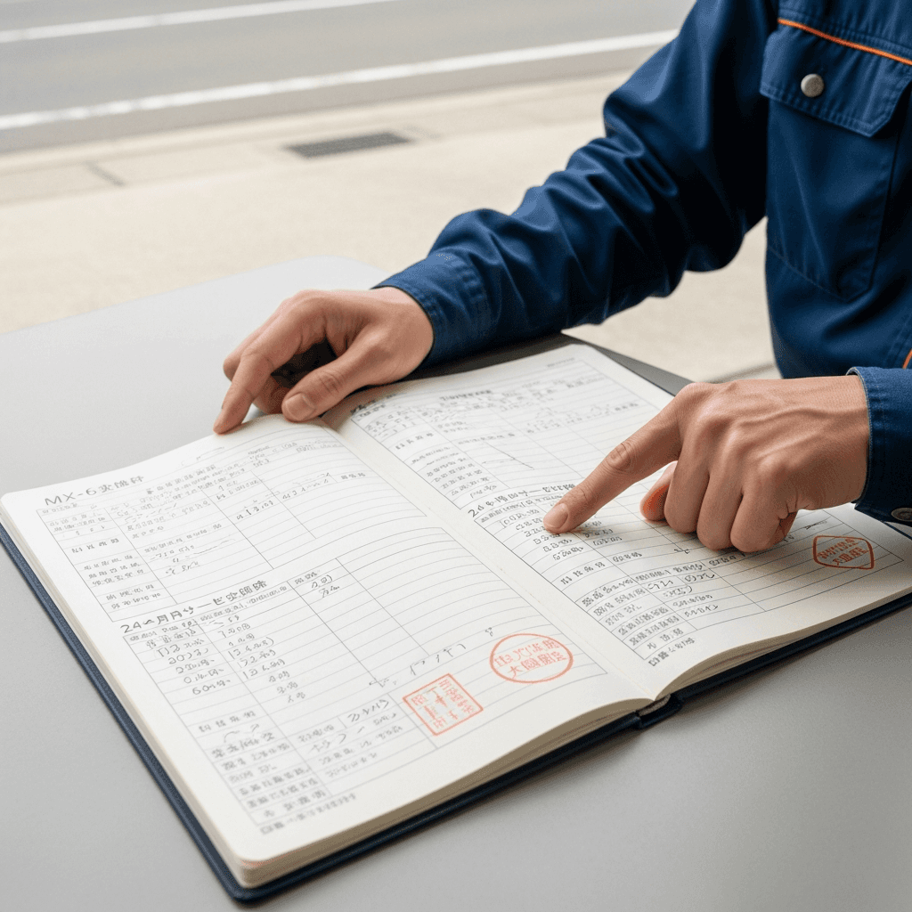 MX-6の整備記録簿に定期点検(12ヶ月・24ヶ月)の履歴が全て記載されていれば「管理の行き届いた車」と高評価。特にエンジンオイル交換履歴は重要で+6~9万円の効果。