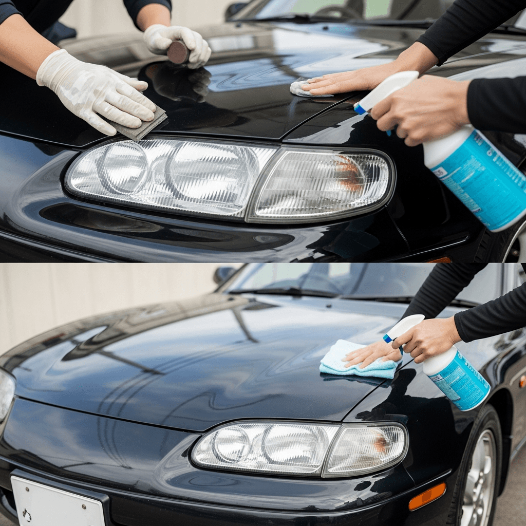 MX-6はヘッドライトの黄ばみとボディの鉄粉が第一印象を損ねます。研磨+鉄粉除去クリーナー+ワックスで輝きを取り戻せば「程度良好」と判断され+4~7万円の効果。