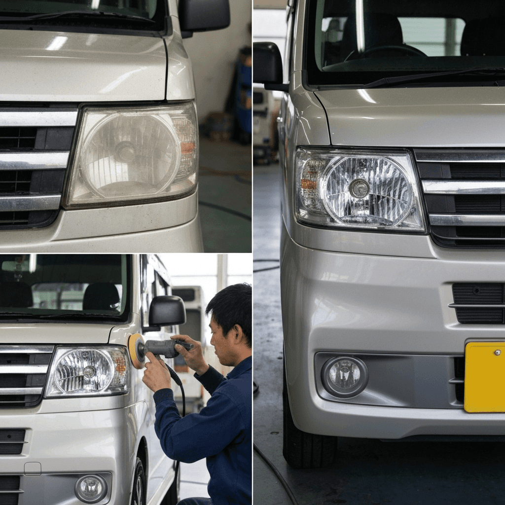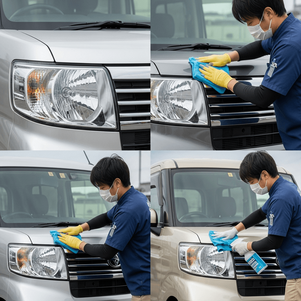 N-VANはヘッドライトの黄ばみとボディの鉄粉が第一印象を損ねます。研磨+鉄粉除去クリーナー+ワックスで輝きを取り戻せば「程度良好」と判断され+4~7万円の効果。