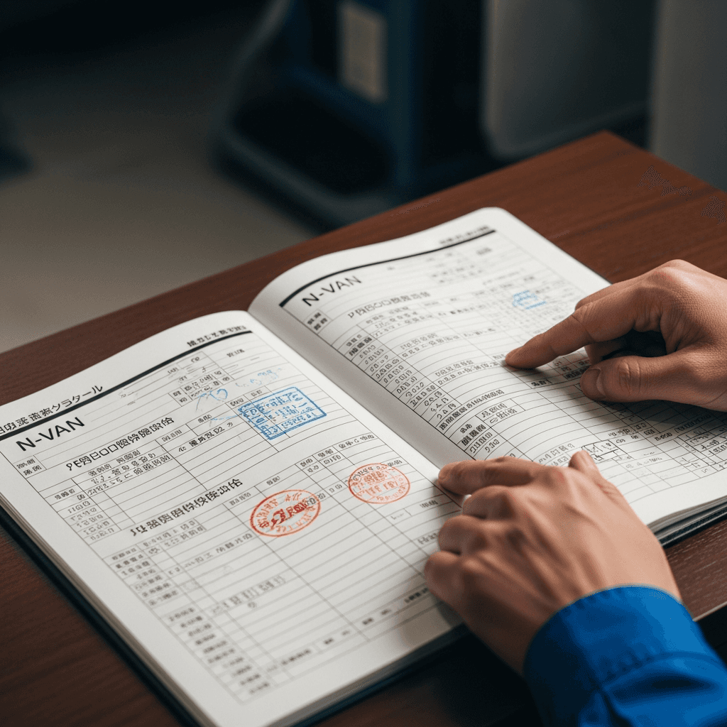 N-VANの整備記録簿に定期点検(12ヶ月・24ヶ月)の履歴が全て記載されていれば「管理の行き届いた車」と高評価。特にエンジンオイル交換履歴は重要で+6~9万円の効果。