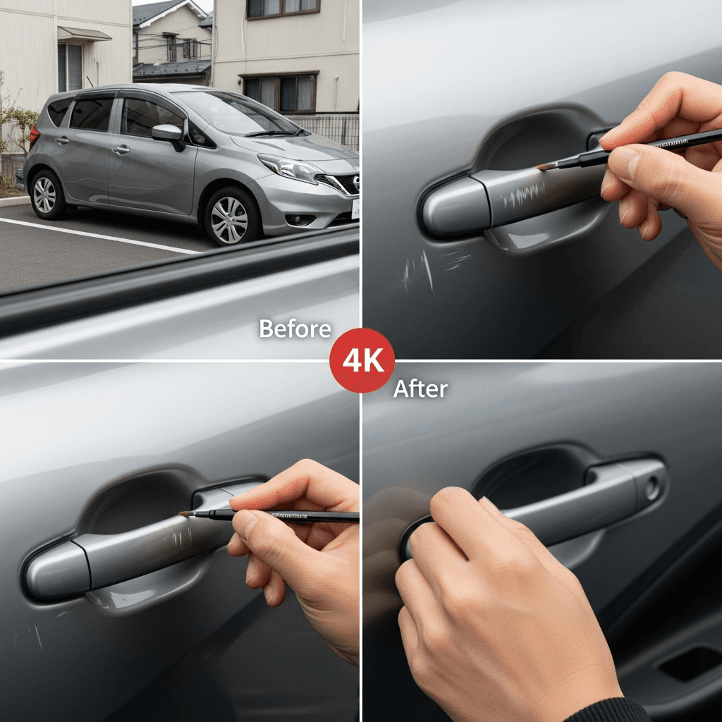 ノートのような実用車は日常使いの小傷が多い。ドアノブ周辺やバンパー角の擦り傷を純正色タッチペンで目立たなくするだけで「丁寧に扱われた車」に見え+3~5万円の効果。