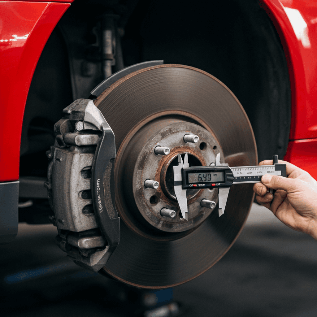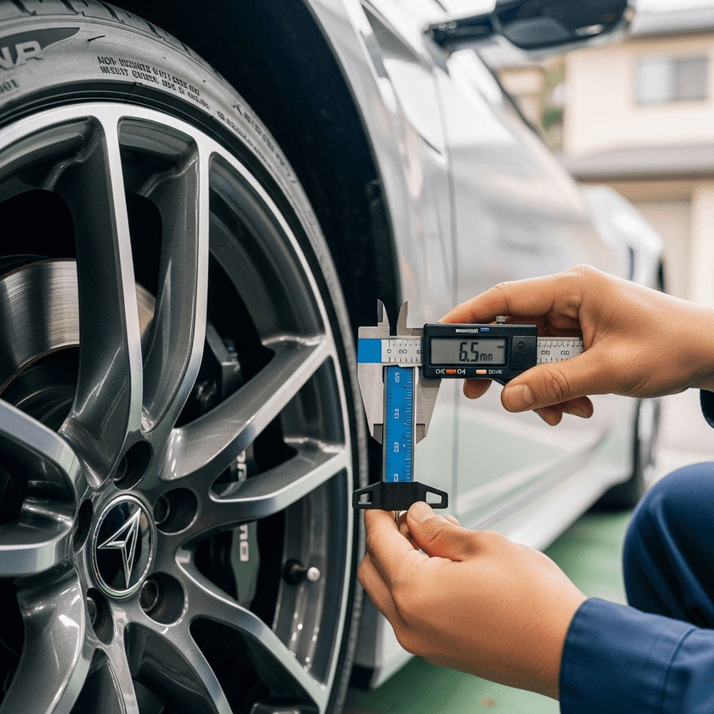 スポーツカーはブレーキとタイヤが査定の最重要項目。パッド残量6mm以上、タイヤ溝5mm以上を写真+ノギス測定値で証明すれば、「走行性能良好」の安心感を与え+8~12万円の評価UP。