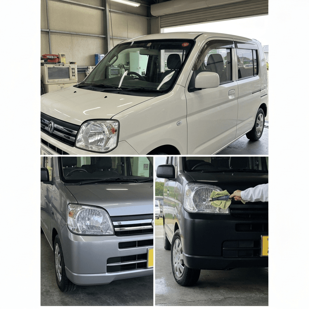 NV100クリッパーリオはヘッドライトの黄ばみとボディの鉄粉が第一印象を損ねます。研磨+鉄粉除去クリーナー+ワックスで輝きを取り戻せば「程度良好」と判断され+4~7万円の効果。
