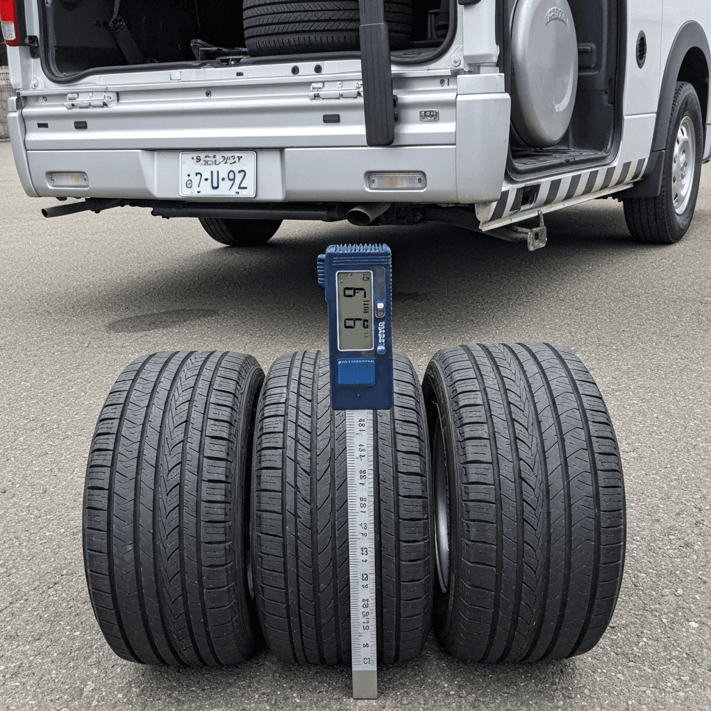 商用車はタイヤが消耗品。4本新品(または溝8mm以上)+スペアタイヤ完備なら「すぐ業務使用可能」で+4~7万円UP。特にNV350キャラバンワゴンは配送業需要が高く効果大。
