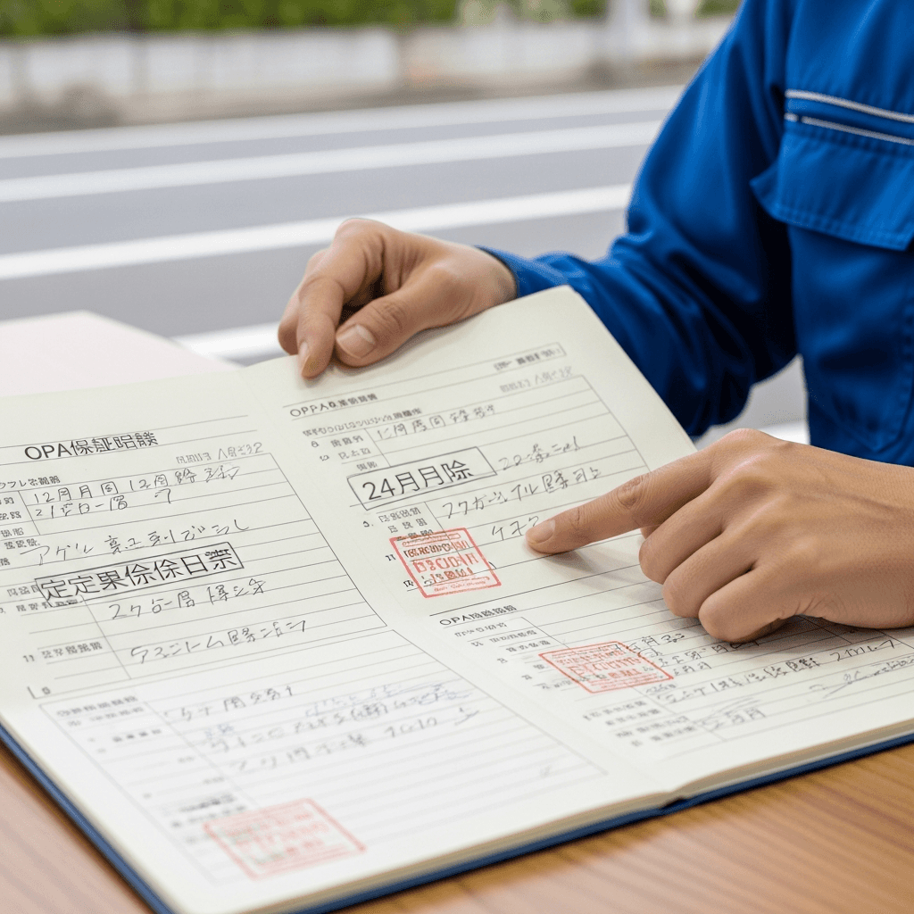 オーパの整備記録簿に定期点検(12ヶ月・24ヶ月)の履歴が全て記載されていれば「管理の行き届いた車」と高評価。特にエンジンオイル交換履歴は重要で+6~9万円の効果。