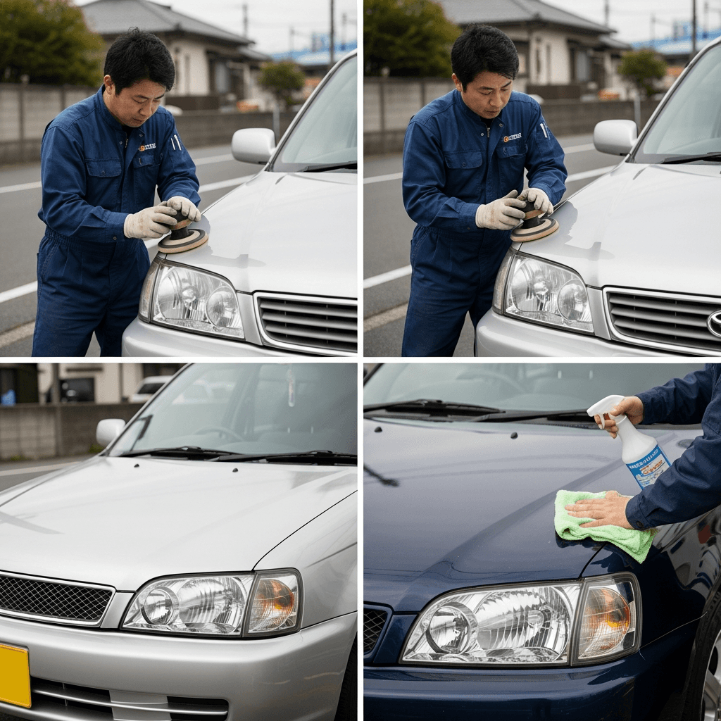 オーパはヘッドライトの黄ばみとボディの鉄粉が第一印象を損ねます。研磨+鉄粉除去クリーナー+ワックスで輝きを取り戻せば「程度良好」と判断され+4~7万円の効果。