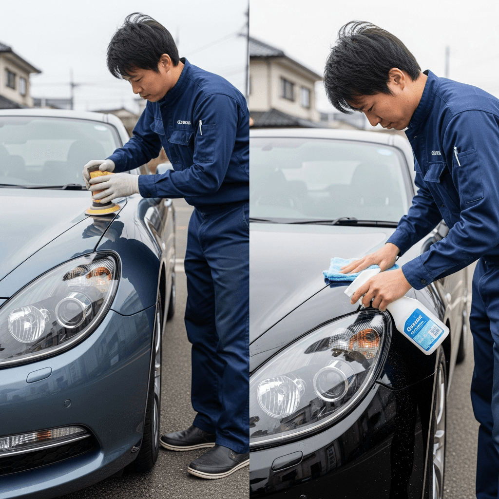 オロチはヘッドライトの黄ばみとボディの鉄粉が第一印象を損ねます。研磨+鉄粉除去クリーナー+ワックスで輝きを取り戻せば「程度良好」と判断され+4~7万円の効果。
