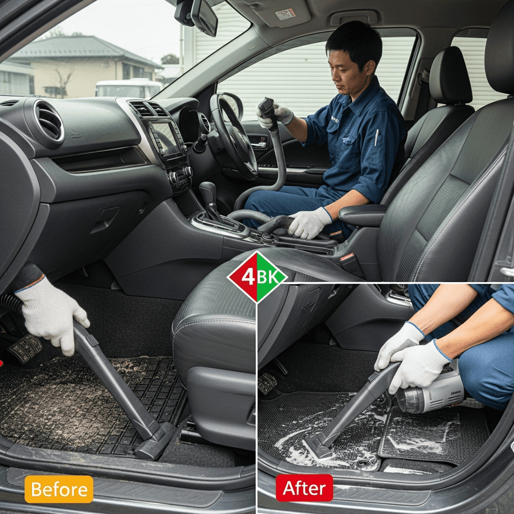 PAネロは第一印象が査定の8割を決めます。シート隙間のゴミ除去、マット洗浄、樹脂パーツ艶出しで新車級の清潔感に。特に臭いゼロなら「禁煙車」扱いで+5~8万円UP。