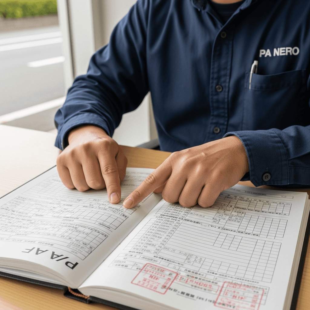 PAネロの整備記録簿に定期点検(12ヶ月・24ヶ月)の履歴が全て記載されていれば「管理の行き届いた車」と高評価。特にエンジンオイル交換履歴は重要で+6~9万円の効果。