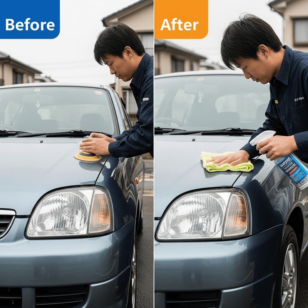 PAネロハッチバックはヘッドライトの黄ばみとボディの鉄粉が第一印象を損ねます。研磨+鉄粉除去クリーナー+ワックスで輝きを取り戻せば「程度良好」と判断され+4~7万円の効果。