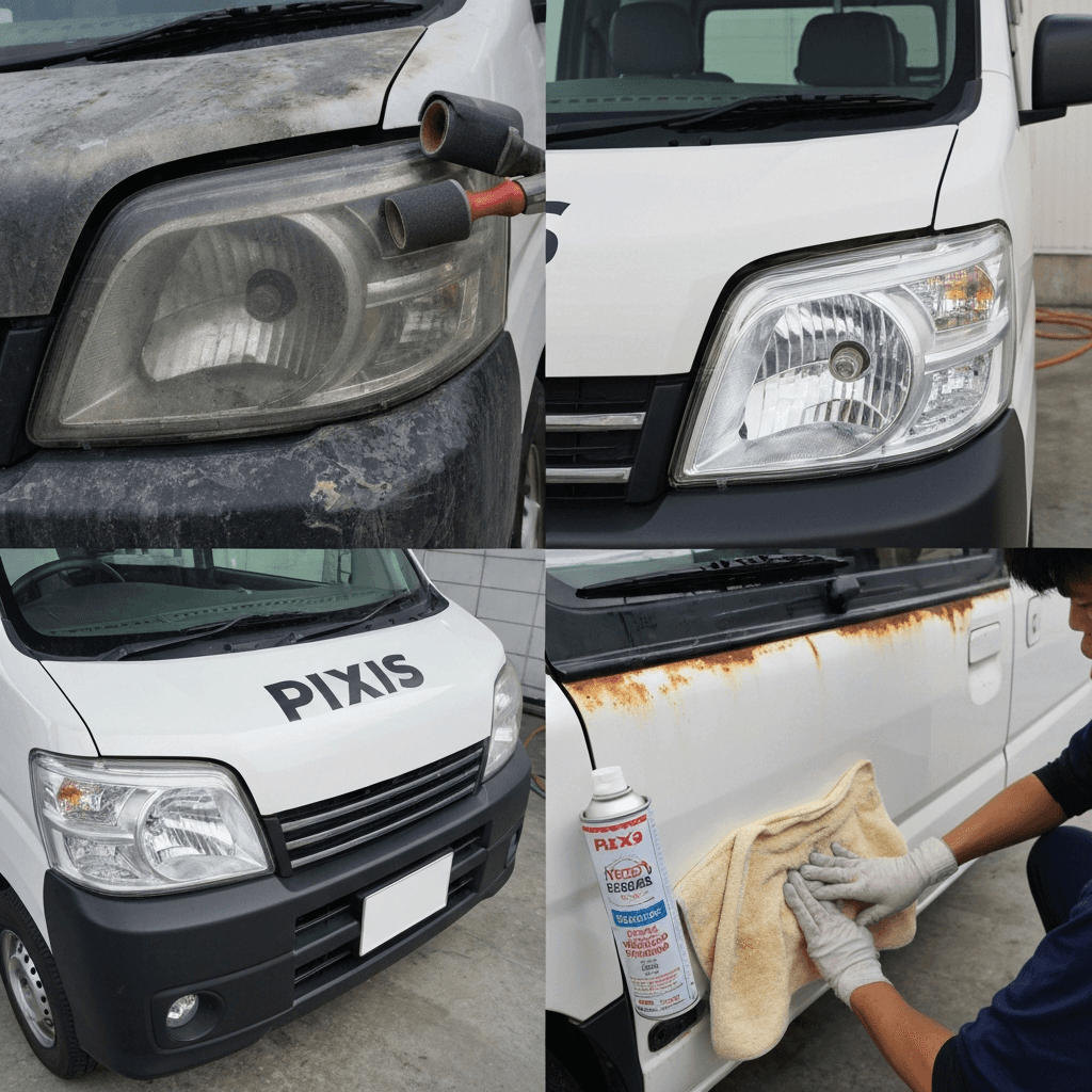 ピクシスバンはヘッドライトの黄ばみとボディの鉄粉が第一印象を損ねます。研磨+鉄粉除去クリーナー+ワックスで輝きを取り戻せば「程度良好」と判断され+4~7万円の効果。