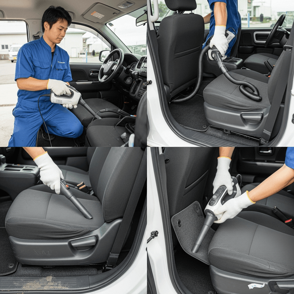 ピクシスバンは第一印象が査定の8割を決めます。シート隙間のゴミ除去、マット洗浄、樹脂パーツ艶出しで新車級の清潔感に。特に臭いゼロなら「禁煙車」扱いで+5~8万円UP。
