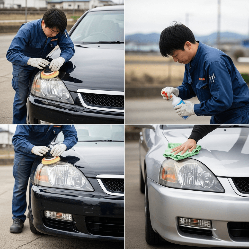 プレリュードインクスはヘッドライトの黄ばみとボディの鉄粉が第一印象を損ねます。研磨+鉄粉除去クリーナー+ワックスで輝きを取り戻せば「程度良好」と判断され+4~7万円の効果。