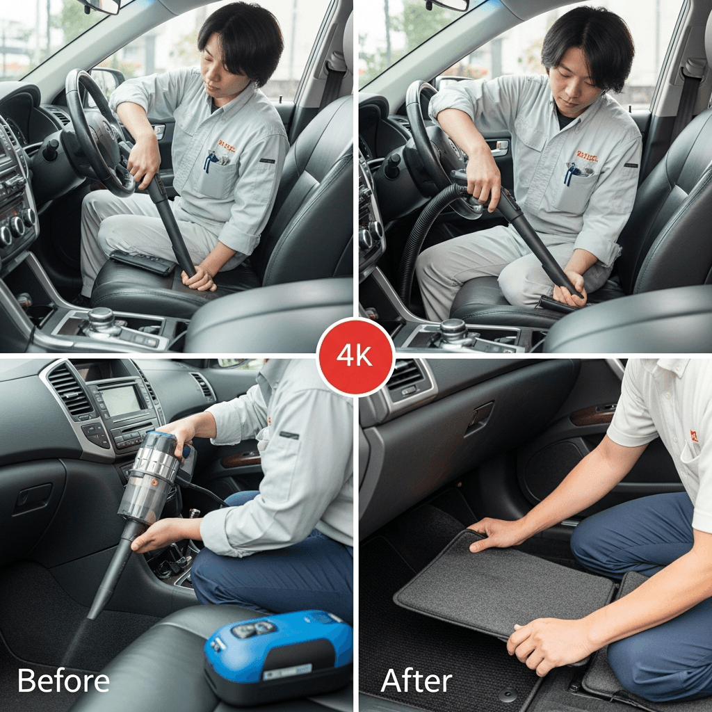 プレジデントは第一印象が査定の8割を決めます。シート隙間のゴミ除去、マット洗浄、樹脂パーツ艶出しで新車級の清潔感に。特に臭いゼロなら「禁煙車」扱いで+5~8万円UP。