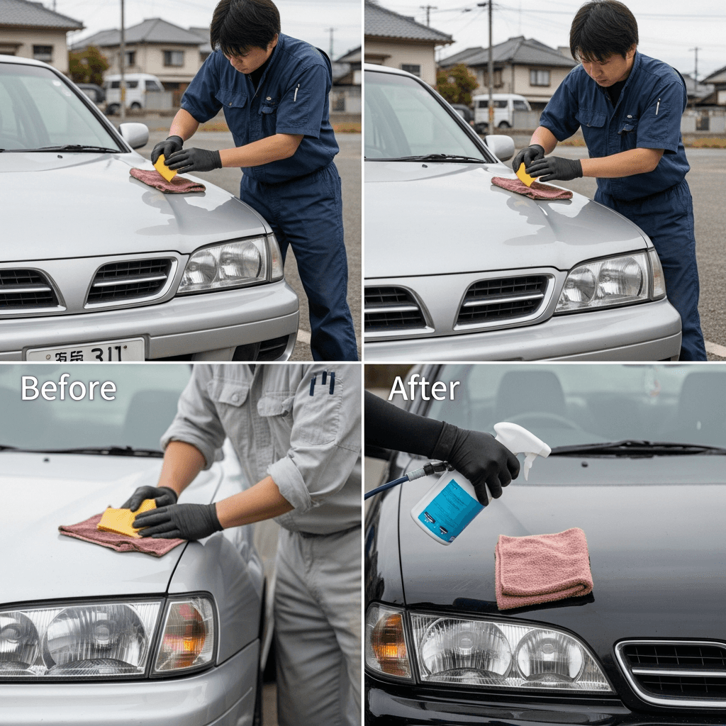 プリメーラはヘッドライトの黄ばみとボディの鉄粉が第一印象を損ねます。研磨+鉄粉除去クリーナー+ワックスで輝きを取り戻せば「程度良好」と判断され+4~7万円の効果。