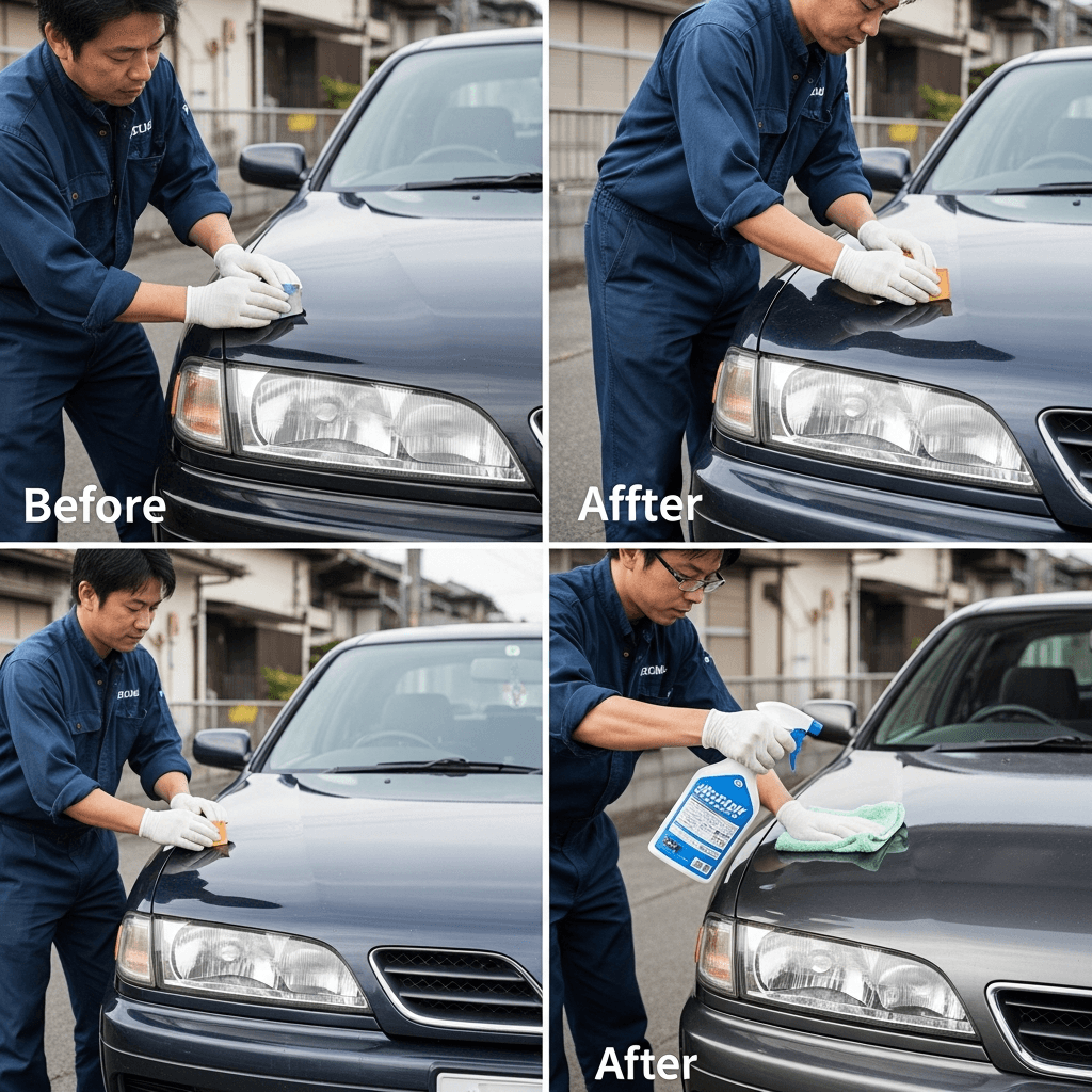 プリメーラカミノワゴンはヘッドライトの黄ばみとボディの鉄粉が第一印象を損ねます。研磨+鉄粉除去クリーナー+ワックスで輝きを取り戻せば「程度良好」と判断され+4~7万円の効果。