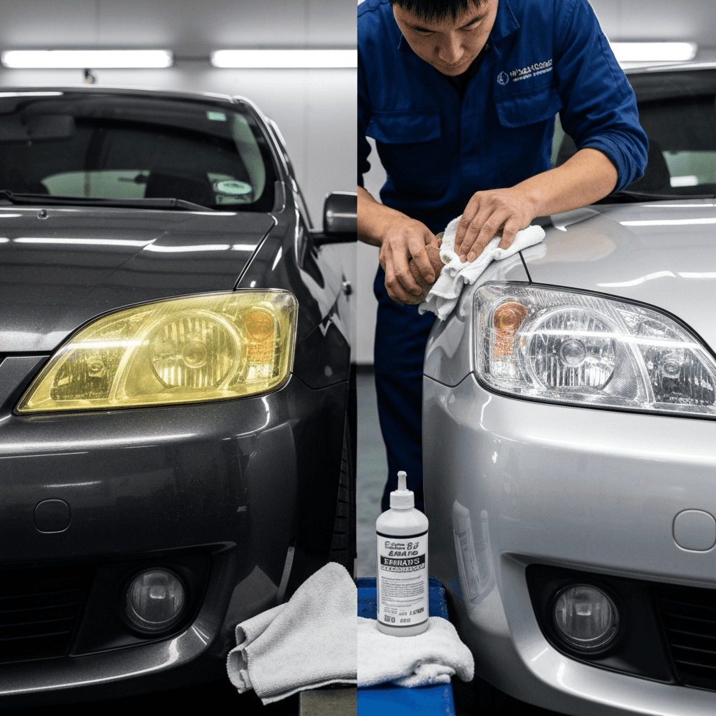 ヘッドライト黄ばみ除去で新車の輝きを取り戻す!
