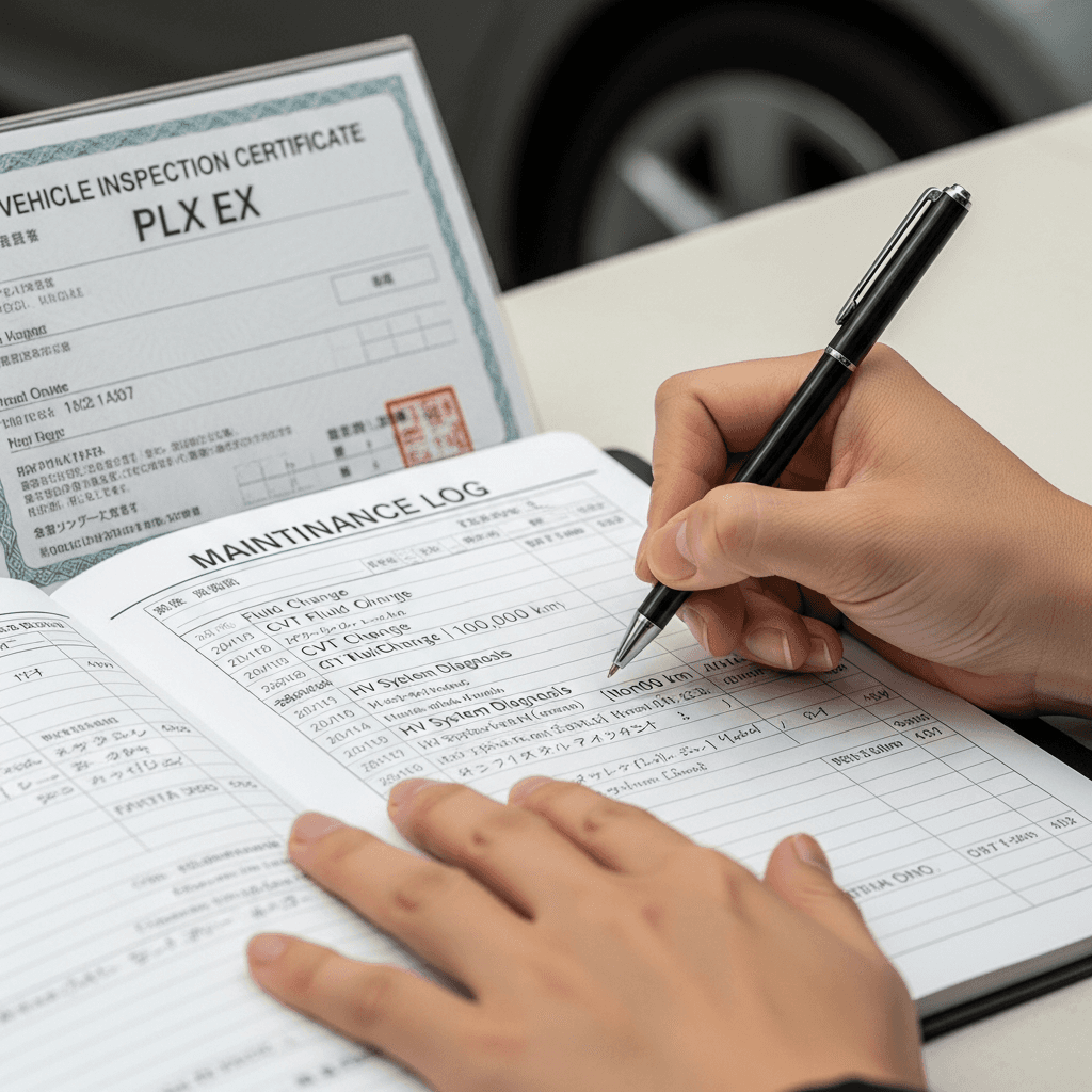 整備記録簿にCVTフルード交換やHVシステム診断の履歴を明記。特に「10万km時CVT交換済」「バッテリー冷却系点検済」の記載があれば査定士の信頼度が急上昇し、+6~10万円の価値創出が可能です。