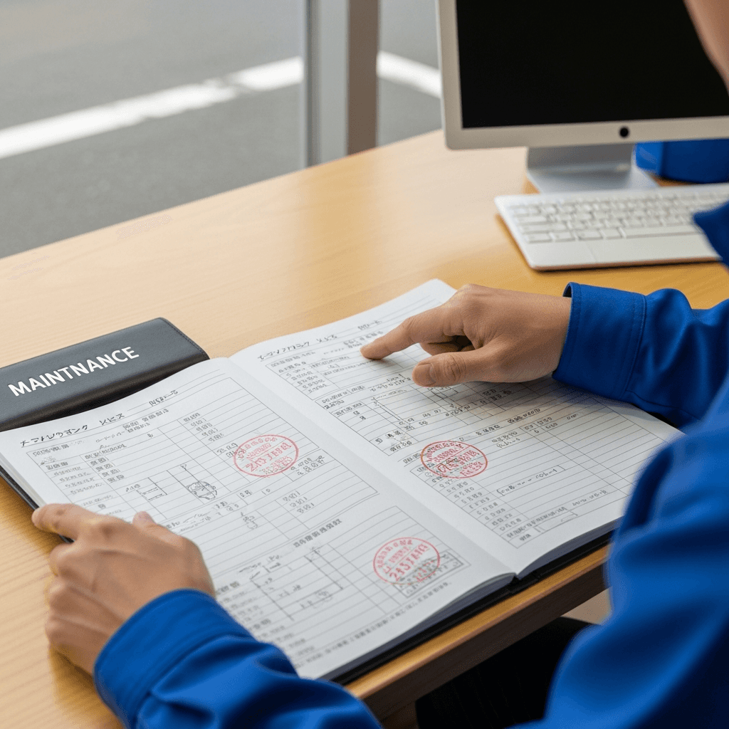 プロシードマービーの整備記録簿に定期点検(12ヶ月・24ヶ月)の履歴が全て記載されていれば「管理の行き届いた車」と高評価。特にエンジンオイル交換履歴は重要で+6~9万円の効果。