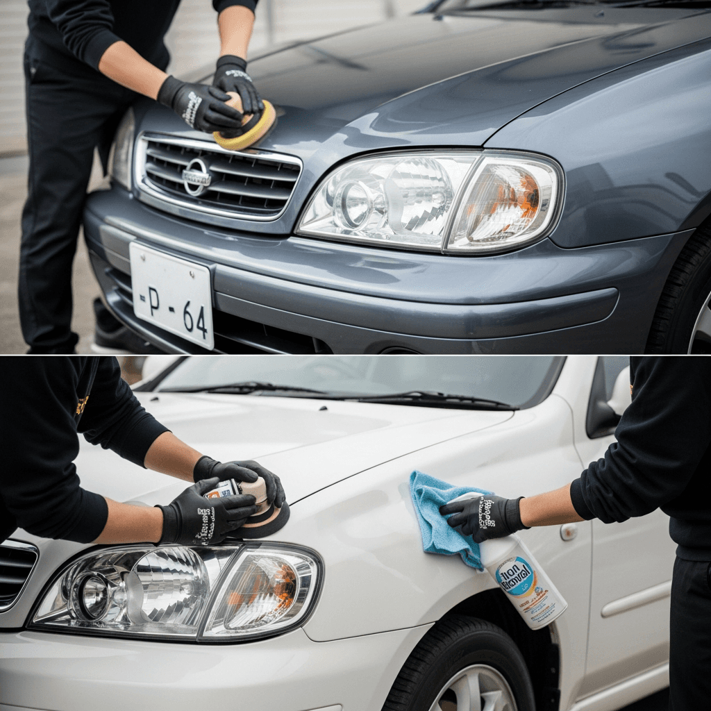 パルサーはヘッドライトの黄ばみとボディの鉄粉が第一印象を損ねます。研磨+鉄粉除去クリーナー+ワックスで輝きを取り戻せば「程度良好」と判断され+4~7万円の効果。