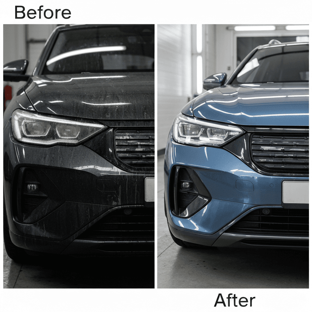 Q4 e-tronはヘッドライトの黄ばみとボディの鉄粉が第一印象を損ねます。研磨+鉄粉除去クリーナー+ワックスで輝きを取り戻せば「程度良好」と判断され+4~7万円の効果。