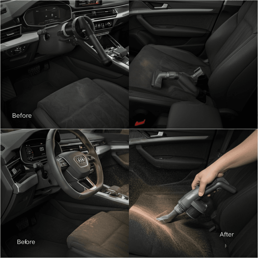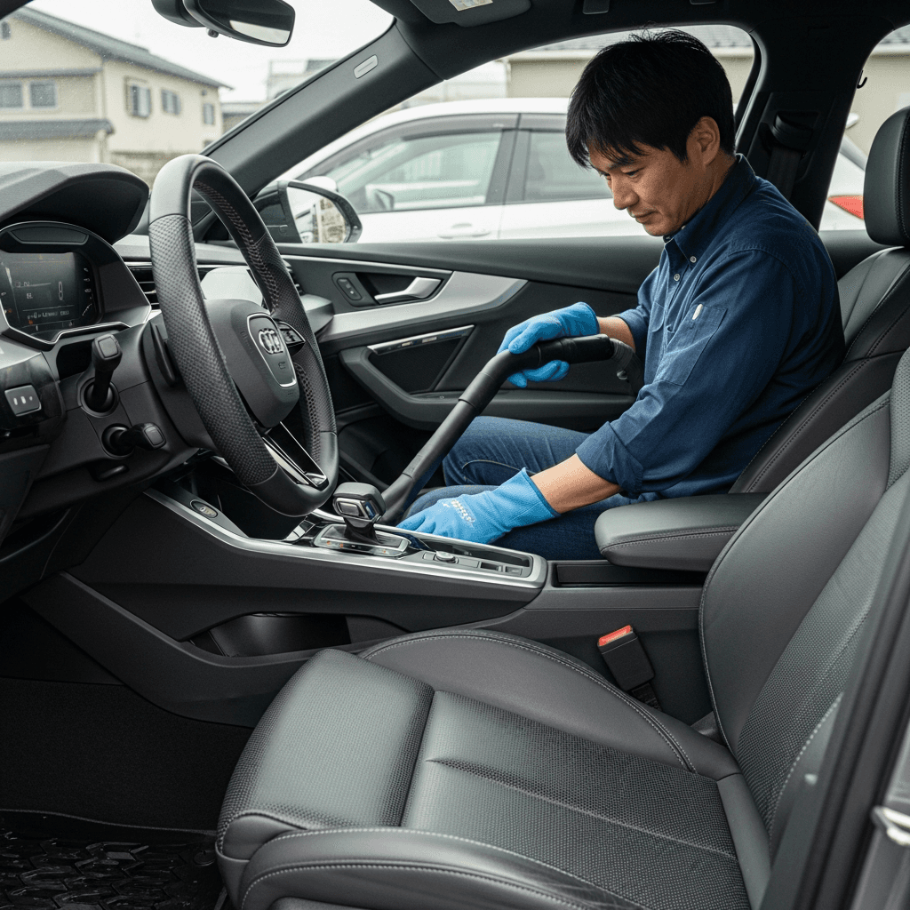 Q4 e-tronは第一印象が査定の8割を決めます。シート隙間のゴミ除去、マット洗浄、樹脂パーツ艶出しで新車級の清潔感に。特に臭いゼロなら「禁煙車」扱いで+5~8万円UP。