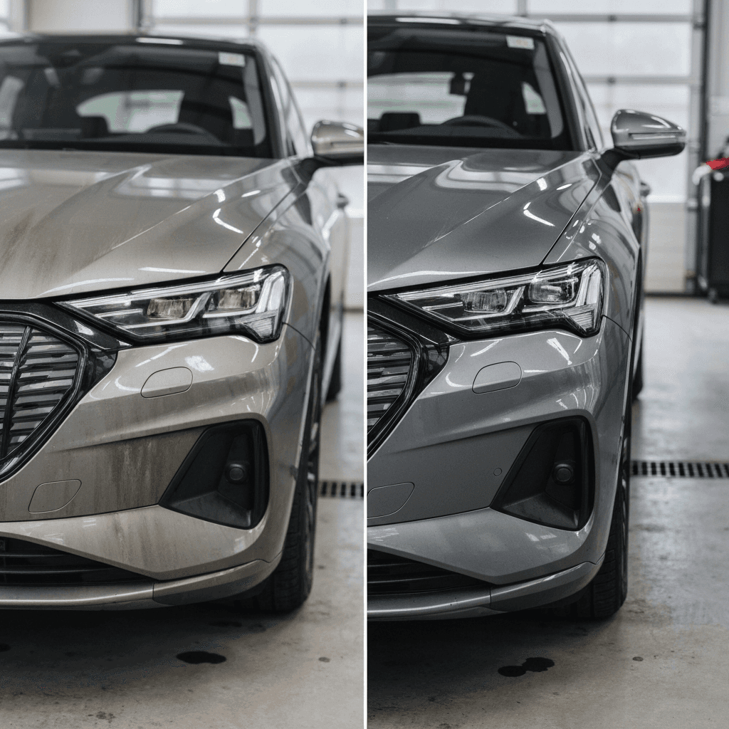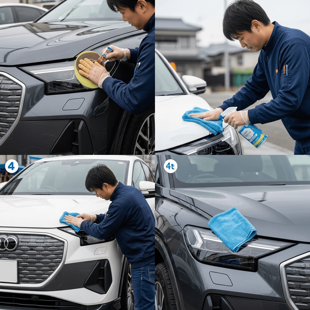 Q4スポーツバックe-tronはヘッドライトの黄ばみとボディの鉄粉が第一印象を損ねます。研磨+鉄粉除去クリーナー+ワックスで輝きを取り戻せば「程度良好」と判断され+4~7万円の効果。