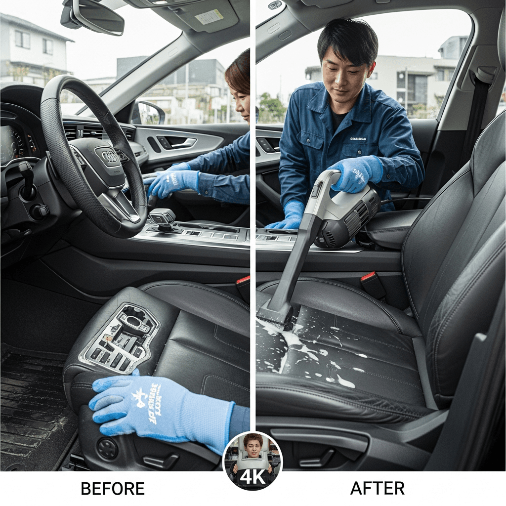 Q6スポーツバックe-tronは第一印象が査定の8割を決めます。シート隙間のゴミ除去、マット洗浄、樹脂パーツ艶出しで新車級の清潔感に。特に臭いゼロなら「禁煙車」扱いで+5~8万円UP。