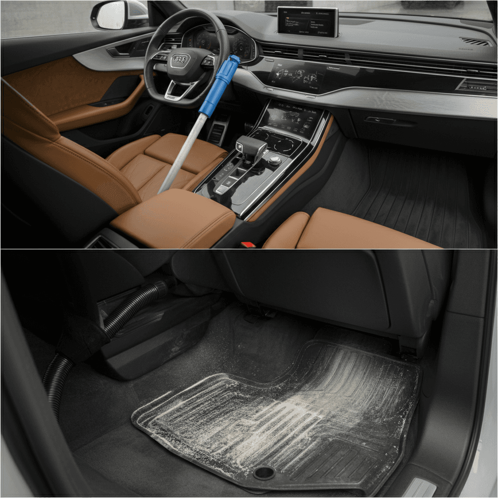 Q8は第一印象が査定の8割を決めます。シート隙間のゴミ除去、マット洗浄、樹脂パーツ艶出しで新車級の清潔感に。特に臭いゼロなら「禁煙車」扱いで+5~8万円UP。