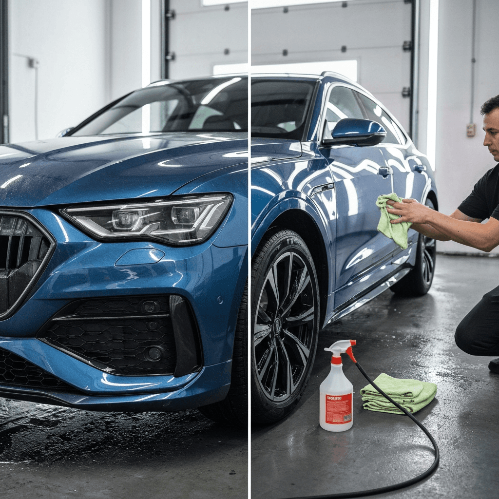 Q8スポーツバックe-tronはヘッドライトの黄ばみとボディの鉄粉が第一印象を損ねます。研磨+鉄粉除去クリーナー+ワックスで輝きを取り戻せば「程度良好」と判断され+4~7万円の効果。