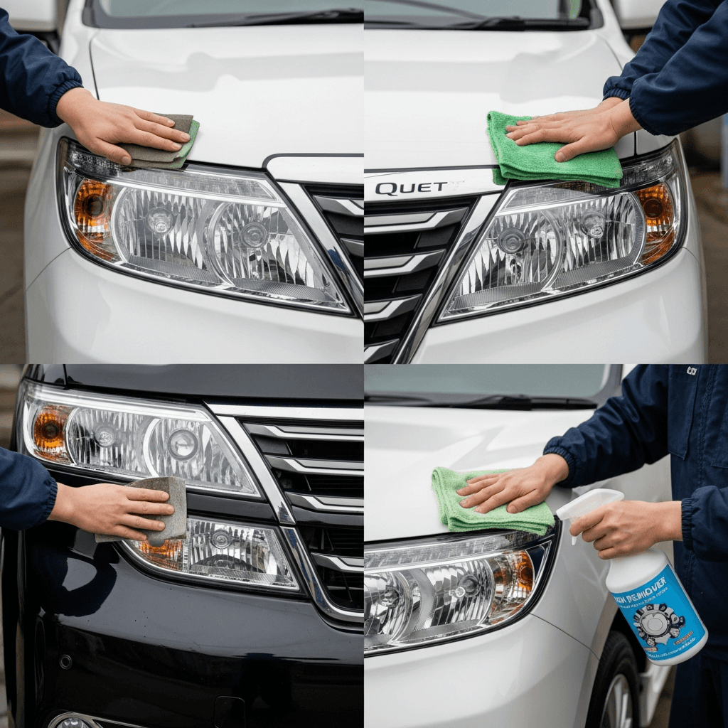 クエストはヘッドライトの黄ばみとボディの鉄粉が第一印象を損ねます。研磨+鉄粉除去クリーナー+ワックスで輝きを取り戻せば「程度良好」と判断され+4~7万円の効果。