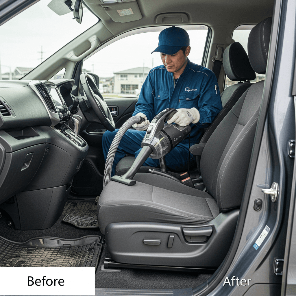 クエストは第一印象が査定の8割を決めます。シート隙間のゴミ除去、マット洗浄、樹脂パーツ艶出しで新車級の清潔感に。特に臭いゼロなら「禁煙車」扱いで+5~8万円UP。