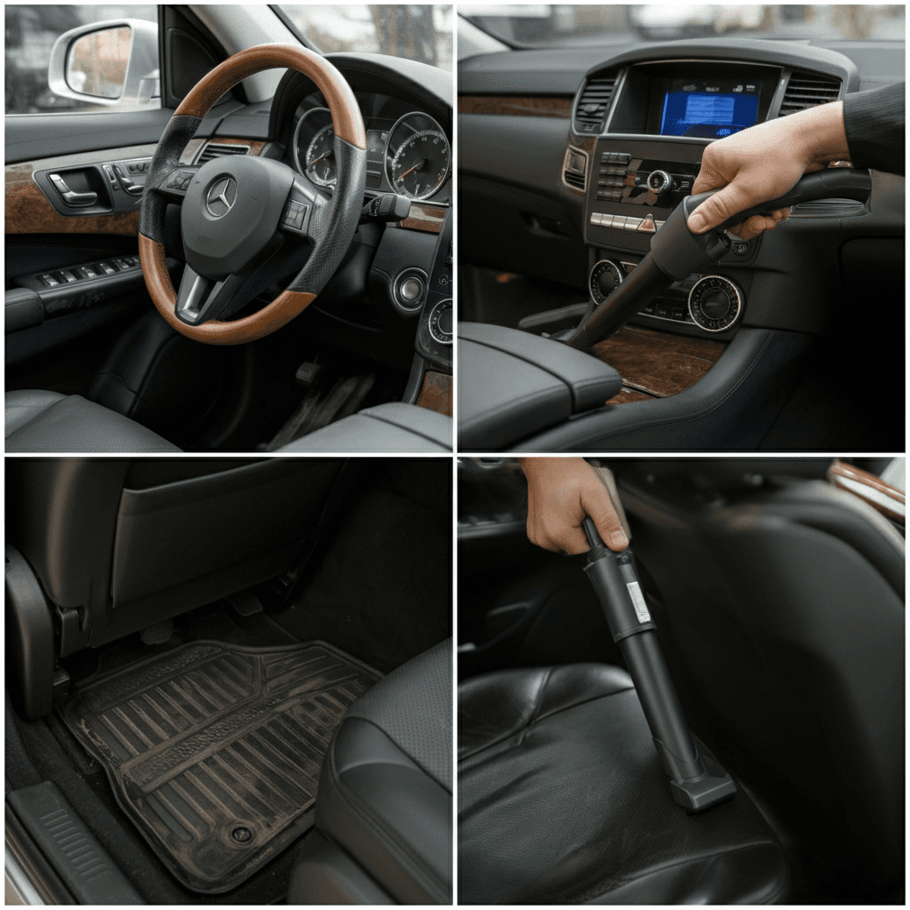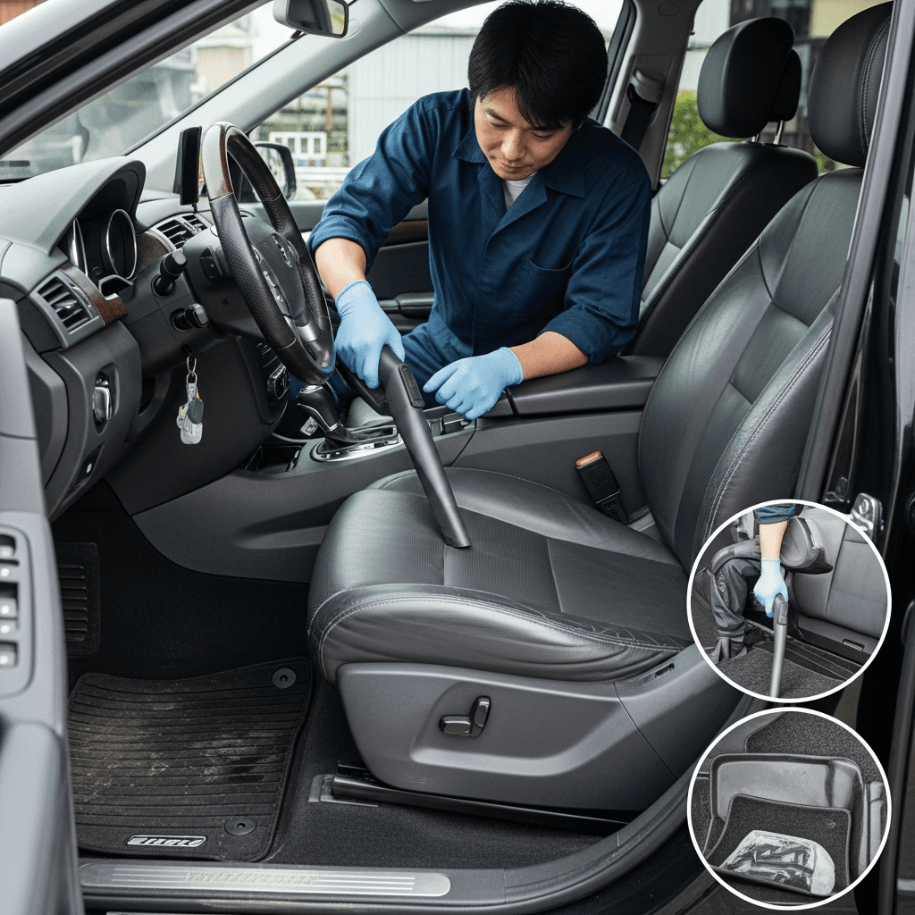 Rクラスは第一印象が査定の8割を決めます。シート隙間のゴミ除去、マット洗浄、樹脂パーツ艶出しで新車級の清潔感に。特に臭いゼロなら「禁煙車」扱いで+5~8万円UP。