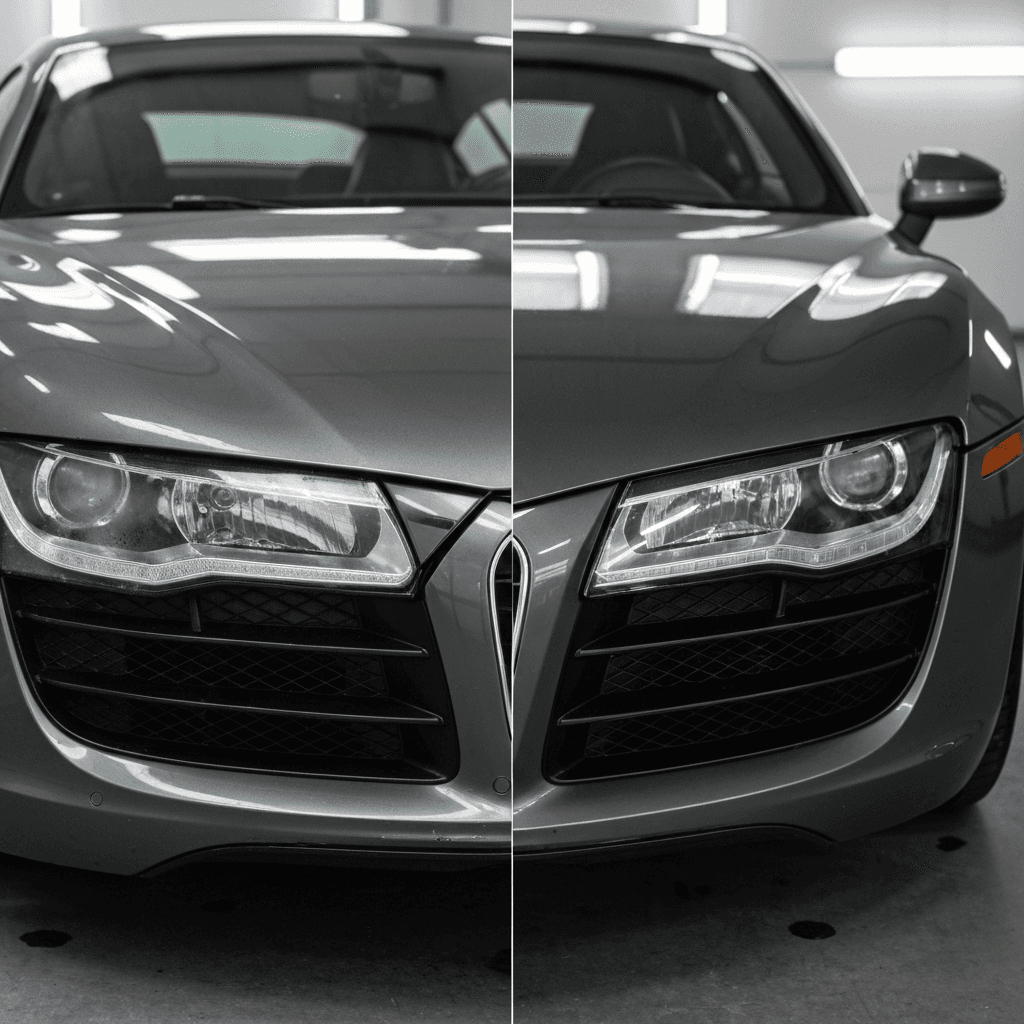 R8はヘッドライトの黄ばみとボディの鉄粉が第一印象を損ねます。研磨+鉄粉除去クリーナー+ワックスで輝きを取り戻せば「程度良好」と判断され+4~7万円の効果。