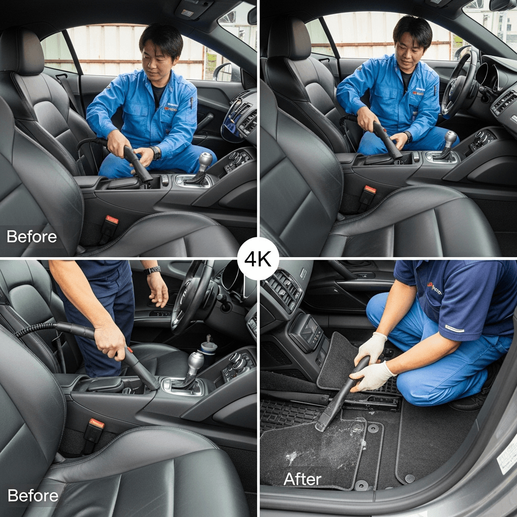 R8スパイダーは第一印象が査定の8割を決めます。シート隙間のゴミ除去、マット洗浄、樹脂パーツ艶出しで新車級の清潔感に。特に臭いゼロなら「禁煙車」扱いで+5~8万円UP。