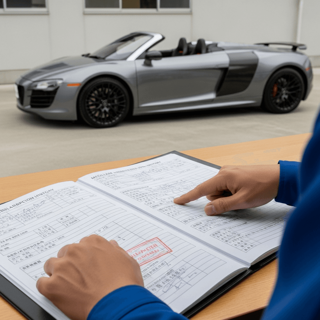 R8スパイダーの整備記録簿に定期点検(12ヶ月・24ヶ月)の履歴が全て記載されていれば「管理の行き届いた車」と高評価。特にエンジンオイル交換履歴は重要で+6~9万円の効果。