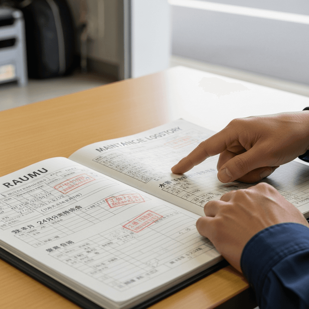 ラウムの整備記録簿に定期点検(12ヶ月・24ヶ月)の履歴が全て記載されていれば「管理の行き届いた車」と高評価。特にエンジンオイル交換履歴は重要で+6~9万円の効果。