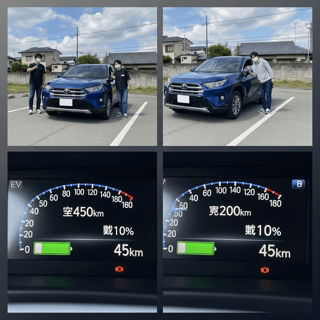満充電から通常走行→残量10%までの実測データ(写真+メモ)を提示すれば「カタログ値通り」の信頼獲得。航続距離不安が購入障壁のEV車で+5~8万円の効果。