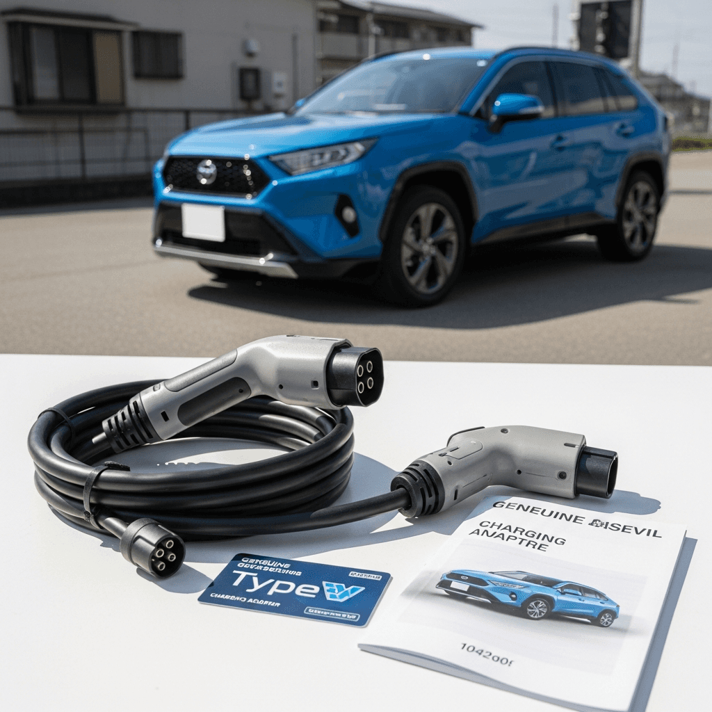EV車の査定は充電環境が全て。RAV4 EVの純正充電ケーブル(普通・急速)、充電カード(会員証)、アダプター類を全て揃えて撮影。「すぐ使える」安心感で+6~10万円UPが期待できます。