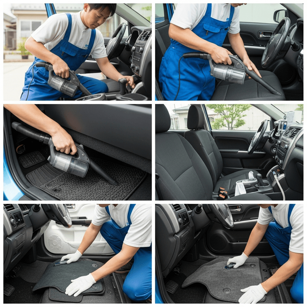 レビューは第一印象が査定の8割を決めます。シート隙間のゴミ除去、マット洗浄、樹脂パーツ艶出しで新車級の清潔感に。特に臭いゼロなら「禁煙車」扱いで+5~8万円UP。