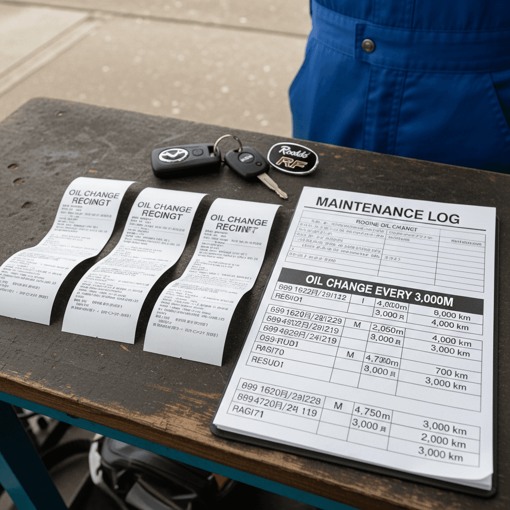ロードスターRFはスポーツ走行を前提とした車。エンジンオイル交換を3,000~5,000km毎に実施した記録(レシート+整備記録簿)があれば「エンジン管理完璧」と評価され、査定額が大幅UP。+10~15万円の効果が期待できます。