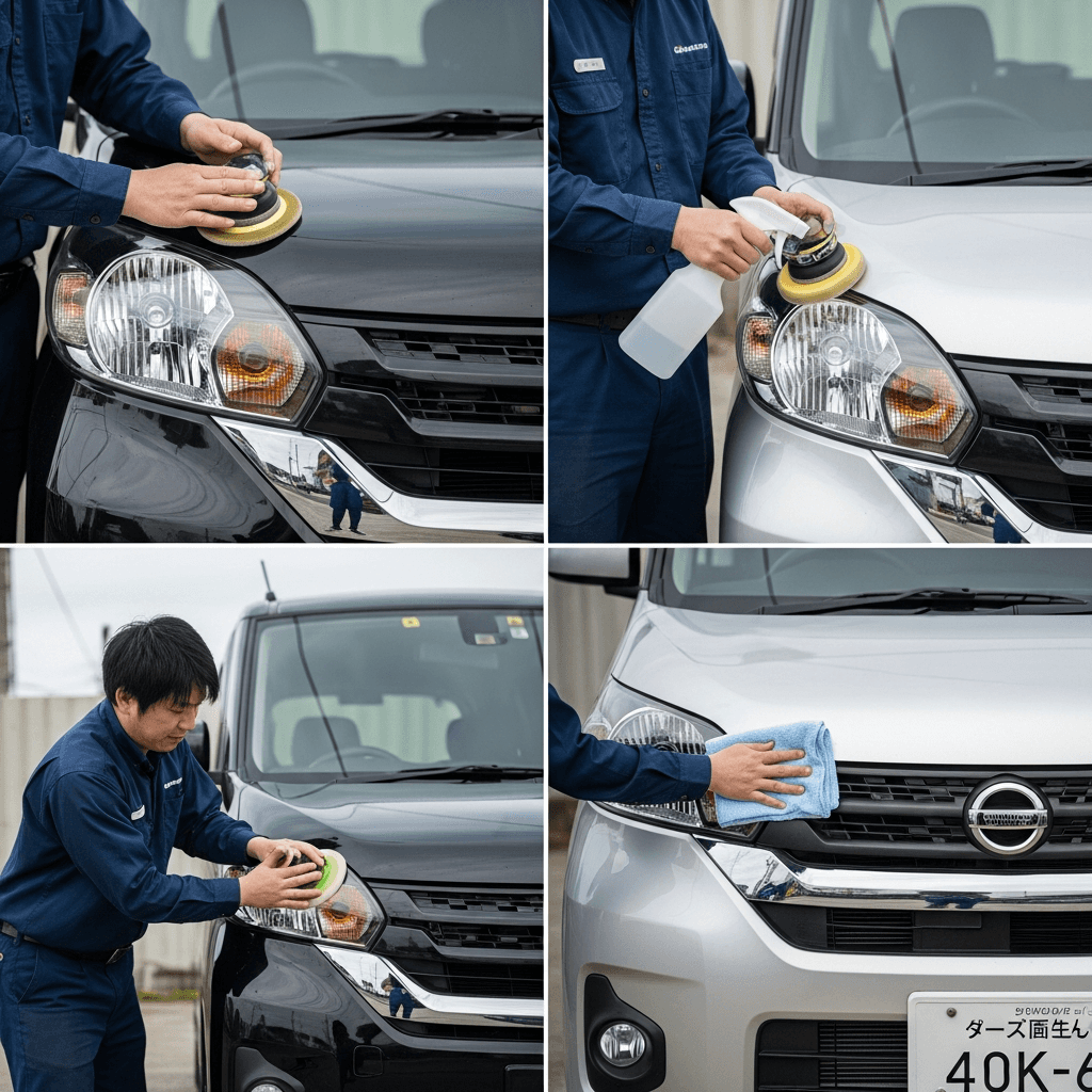ルークスはヘッドライトの黄ばみとボディの鉄粉が第一印象を損ねます。研磨+鉄粉除去クリーナー+ワックスで輝きを取り戻せば「程度良好」と判断され+4~7万円の効果。