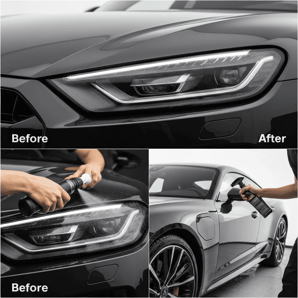 RS e-tron GTはヘッドライトの黄ばみとボディの鉄粉が第一印象を損ねます。研磨+鉄粉除去クリーナー+ワックスで輝きを取り戻せば「程度良好」と判断され+4~7万円の効果。