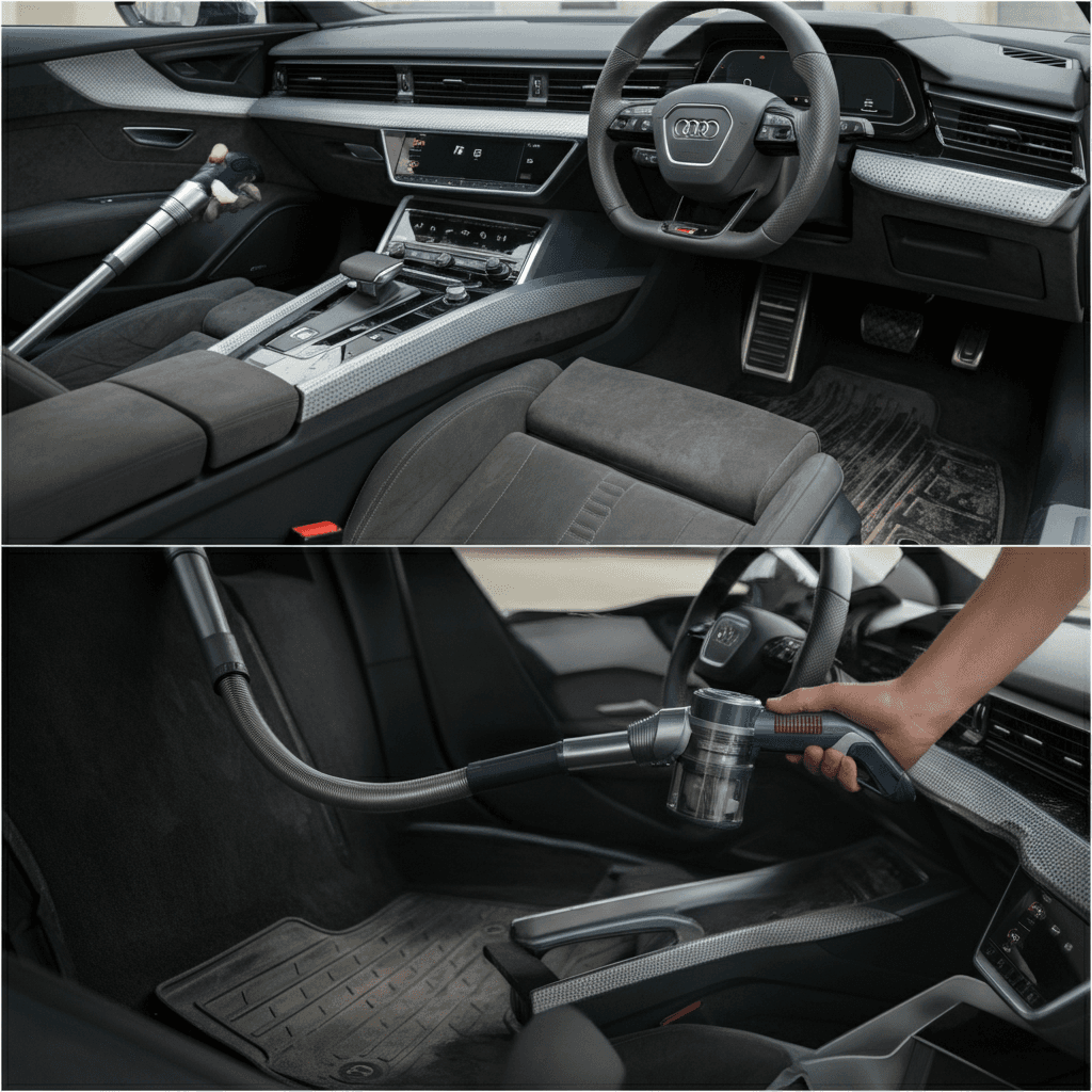 RS e-tron GTは第一印象が査定の8割を決めます。シート隙間のゴミ除去、マット洗浄、樹脂パーツ艶出しで新車級の清潔感に。特に臭いゼロなら「禁煙車」扱いで+5~8万円UP。